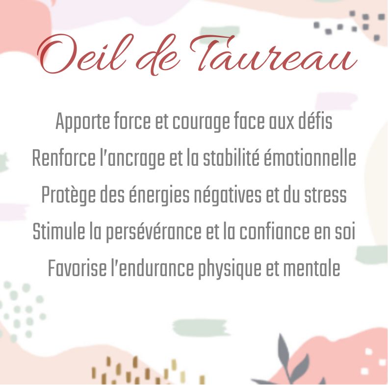 « L’Œil de Taureau, c’est la pierre du guerrier calme. Celui qui avance, centré, aligné, sans crainte ni précipitation. Elle donne cette force tranquille qui permet de tenir bon, sans se perdre. »